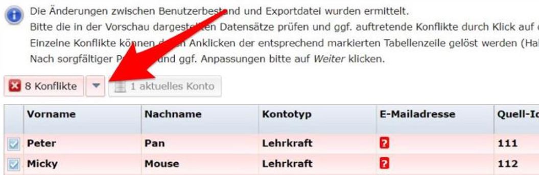 Im Folgenden sind alle Datensätze rot markiert. Über das Icon "Konflikt" wird das Thema gelöst: