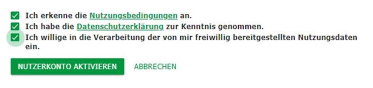 Es folgt die Aufforderung, den Nutzungsbedingungen und der Datenschutzerklärung zuzustimmen, bevor man das NUTZERKONTO AKTIVIEREN kann:
