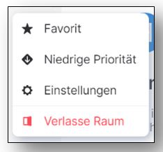 Über die 3 Punkte neben dem Raum auf der rechten Seite des Bildschirms (bei der App durch langes Gedrückt-Halten) erscheinen die gleichen Auswahlmöglichkeiten wie beim privaten Chat, also z.B. Einstellungen, Priorisierung oder Raum verlassen. Zusätzlich kann ein Direkt-Link zu dem Raum abgerufen werden.