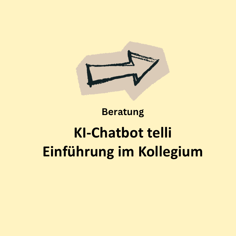 Beratung zur Entwicklung und Fortschreibung schulischer Regelungen zum Einsatz von KI (z. B. Nutzungsvereinbarungen, Leitlinien, schulinterne Absprachen). Darüber hinaus Unterstützung bei der Integration vom KI-Chatbot telli in schulische Entwicklungsprozesse sowie bei der Weiterentwicklung von Unterrichtsszenarien und Assistenten auf Grundlage schulischer Erfahrungen.